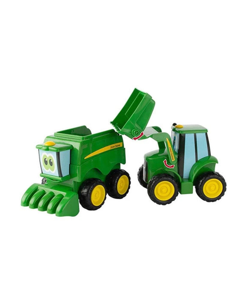 Set van twee John Deere speelgoed machines voor jonge kinderen. De eerste is een combine voor het oogsten van graan. De andere is een trekker met opschepbak.
