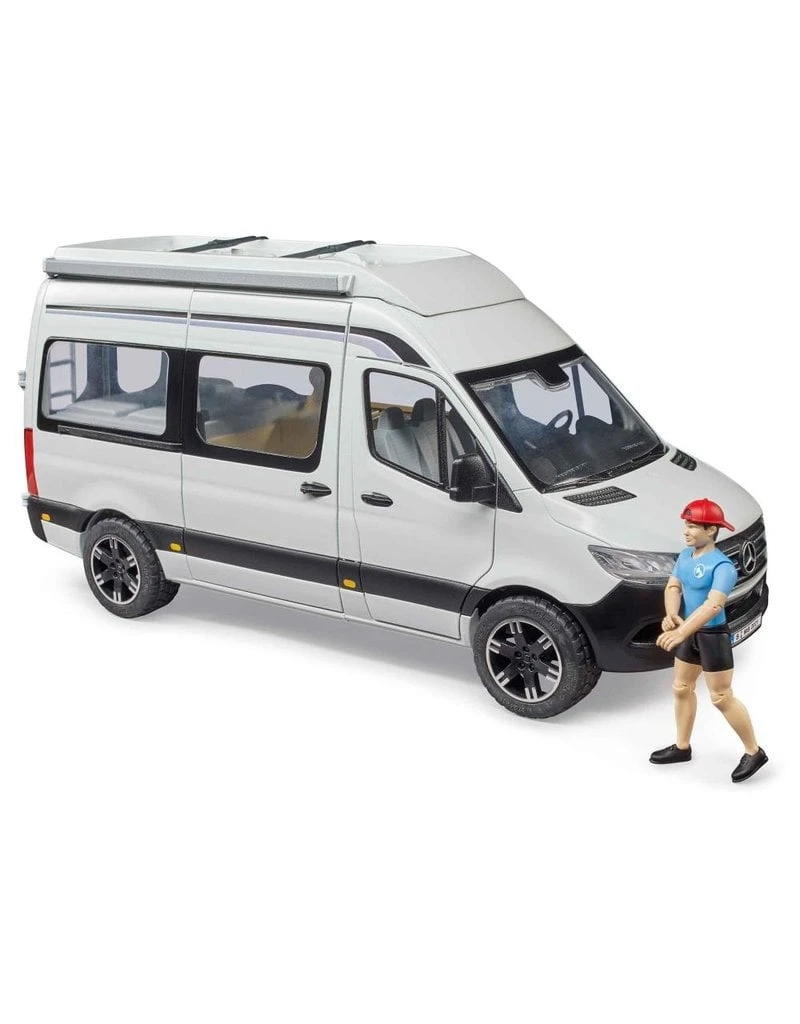 Grote speelgoed camper. Bruder maakt de camper met een Mercedes Sprinter als basis. De witte bus heeft een mooi interieur en campeer tafelset.