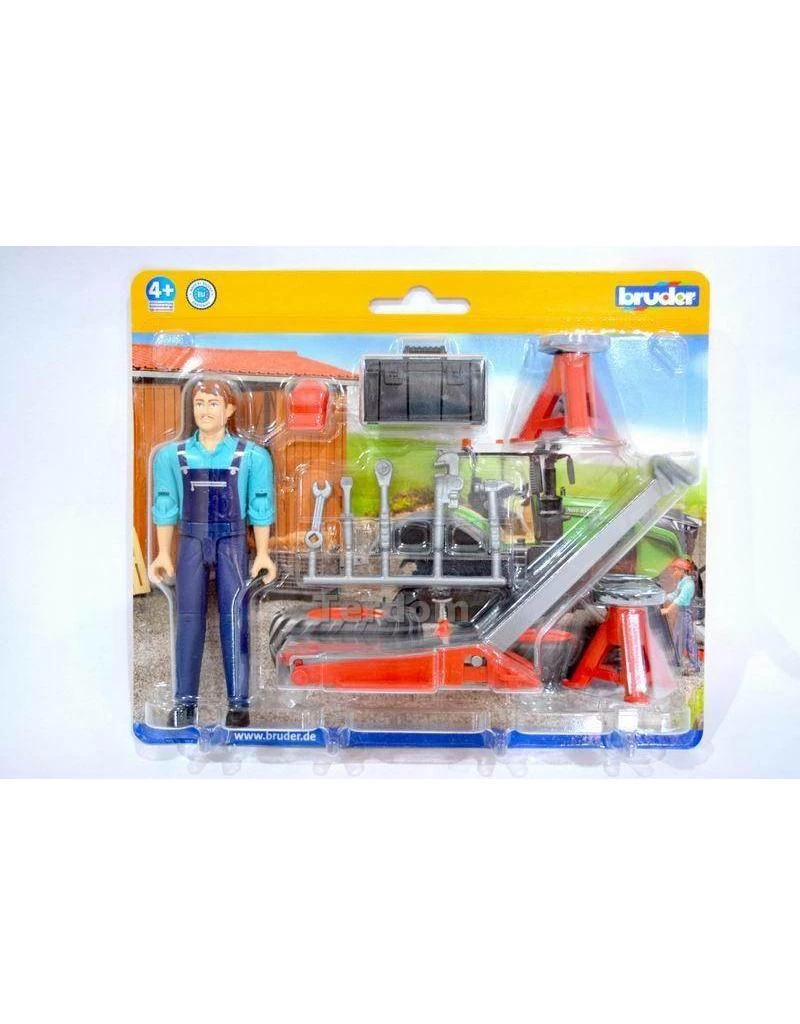 De krik eronder en op de bokken zetten. Repareer nu elke tractor,vrachtauto of auto met deze leuke garage set met monteur.