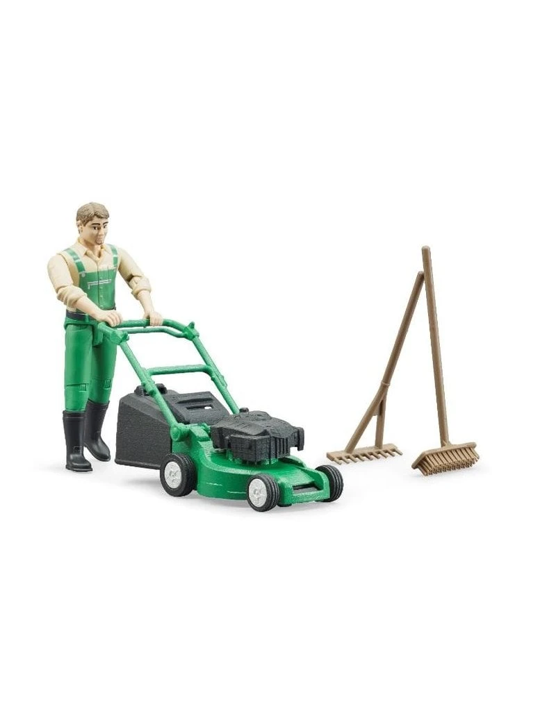 Speelfiguur met tuin overal aan en laarzen. Samen met de gazonmaaier, hark en bezem een complete set voor je tuin onderhoud.