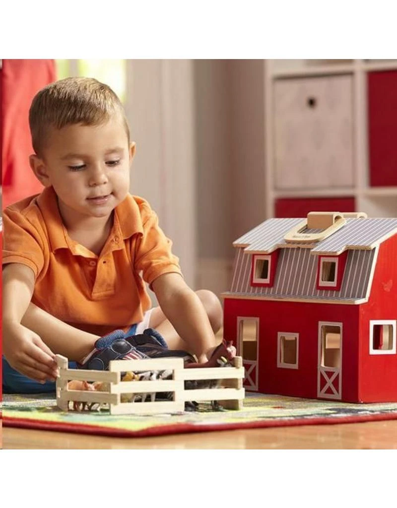 De helderrode schuur met twee verdiepingen is gevuld met zeven realistische plastic boerderijdieren, een houten ladder en een opvouwbare stal.