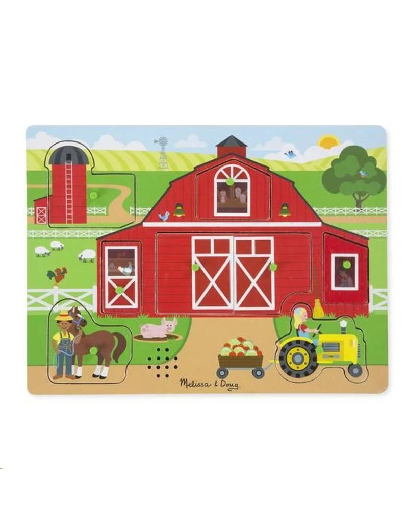 Til een van de acht puzzelstukken op om te zien en te horen wat er op deze drukke boerderij gebeurt! Met deze unieke geluidspuzzel kunnen kinderen leren hoe een koe in de schuur wordt gemolken, een tractor wordt opgestart en nog veel meer. Vervang het stuk om het geluid onmiddellijk te stoppen en naar het volgende deel van de boerderij te gaan! Kinderen van twee jaar en ouder zullen het leuk vinden om de boerderij te verkennen en nieuwe, afbeeldingen onder elk stuk te ontdekken en te leren wat de realistische geluiden maakt. De interactieve, stevige houten puzzel helpt bij het ontwikkelen van fijne motoriek en auditieve verwerkingsvaardigheden en stimuleert het oplossen van problemen en het verhalende denken.