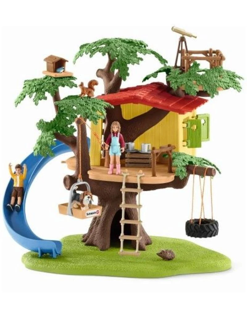 In het Schleich®-boomhut kunnen de twee kinderen van de boerenfamilie Sarah en Ben urenlang ravotten, spelen en picknicken. Wie heeft er nog niet van een eigen boomhut gedroomd? De set bevat veel functies voor langdurig plezier. Terwijl Ben de dieren op het observatiedek bekijkt, glijdt Sarah door de glijbaan. De hondenpuppy wacht al op haar. Sarah kan via de ladder de boomhut binnen. Met behulp van de katrol kan de schattige beagle pup gemakkelijk naar de gezellige boomhut worden gebracht. Zodat iedereen samen kan spelen. In de grot in de boomstam heeft de egel zijn eigen huis en ook de kleine vogel houdt van zijn eigen rijk in het gebladerte. Met 2 menselijke figuren, 4 dieren en geweldige accessoires. De set is de ideale aanvulling op de apart beschikbare grote boerderij 42407 met stallen en dieren. De Schleich®-figuren zijn allemaal in detail gemodelleerd, liefdevol geverfd en staan ??voor educatieve waardevolle spellen.