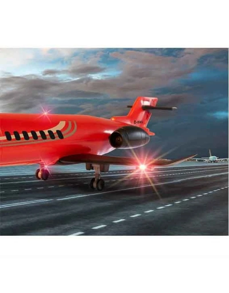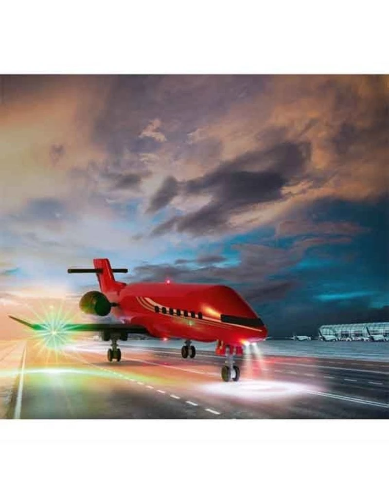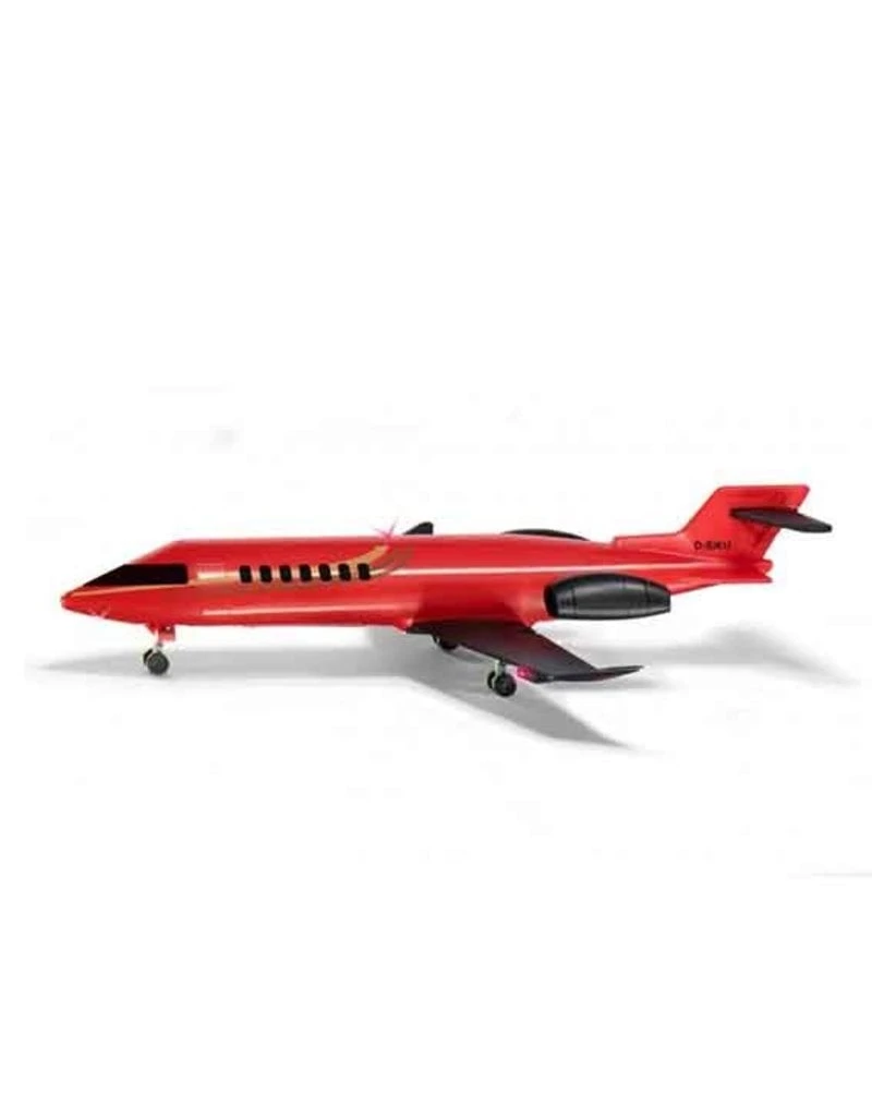 Speelgoed model vliegtuig. Een compact vliegtuig in een rode kleur met landingslichten.
