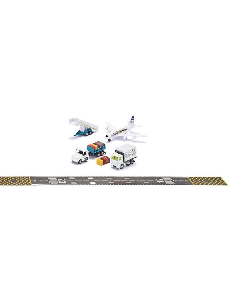 Vliegtuigen zijn fascinerend voor grote en kleine passagiers. Steeds aankomende en vertrekkende vliegtuigen, tussendoor rondrijdende trekkers en bussen. De nieuwe SIKU luchthaven set bestaat uit een viermotorig verkeersvliegtuig, een cateringvoertuig voor de verzorging aan boord, een aanhanger met een vliegtuigtrap, een trekker en een bagagetrolley. De bagagetrolley kan met behulp van een schaarmechaniek in hoogte worden versteld. Hierdoor wordt in combinatie met de voor- en achterklep het be- en ontladen van de koffers vereenvoudigd. Deze kunnen ook worden geopend. Aan de trekker kan niet alleen de bagagetrolley worden gehangen maar ook de vliegtuigtrap van metalen en kunststof onderdelen. Maar waar starten en landen de vliegtuigen? In de set is een vijf meter lange rol zelfklevende tape opgenomen die is bedrukt met de typische markeringen. Deze tape kan eenvoudig met de schaar op maat worden geknipt en hecht op een gladde vloer of een kortpolig tapijt. De luchthaven set is de ideale aanvulling bij het SIKUWORLD verkeersvliegtuig (artikelnummer 5402).